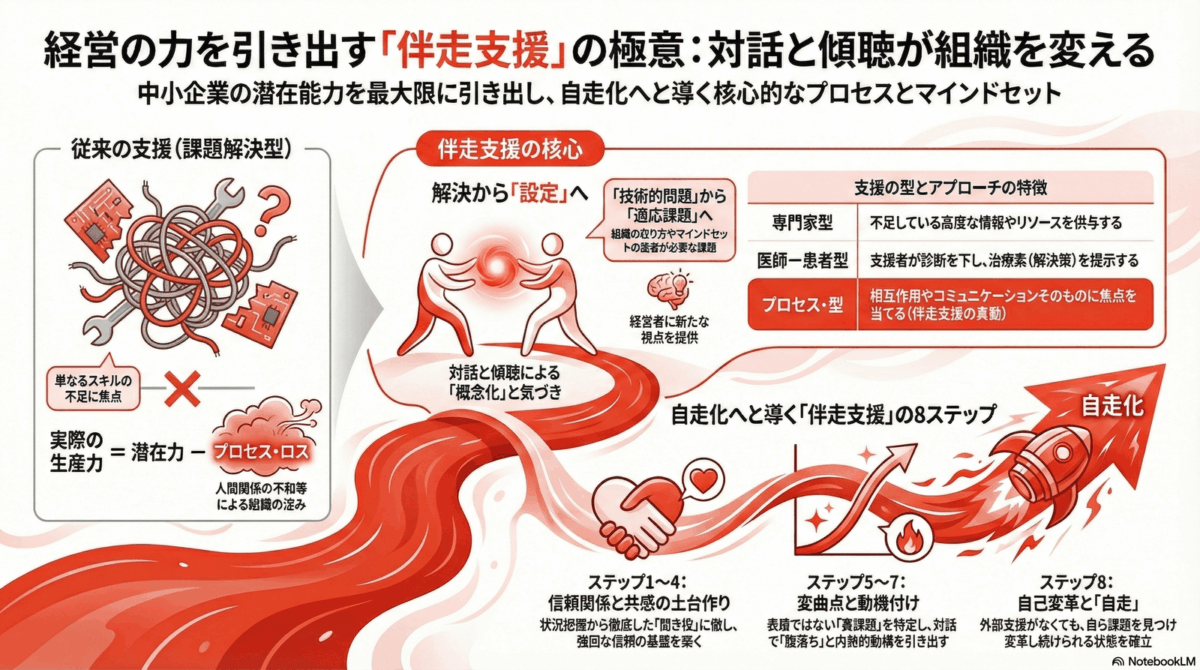 支援の形態は,クライアントが持ち得ない高度な情報やリソースを供与する「専門家型」,専門家が診断を下し治療案を提示する「医師ー患者型」,そして支援者がクライアントとの相互作用やコミュニケーションそのものに焦点を当てる「プロセス・コンサルテーション」の3類型に大別される。伴走支援の真髄は,この「プロセス・コンサルテーション」を主軸に据え,複雑に絡み合った適応課題へとアプローチする点にある。