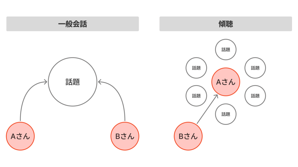 一般会話と傾聴の違いをよく理解することが大切である。一般会話の中心は「話題」だが,傾聴の中心は「話し手」である。一般会話はある話題に対して話し手が従属する関係にあるが,傾聴ではあくまでも話の中心は話し手であり,話題がたまたま挙がっているだけという関係として整理される。