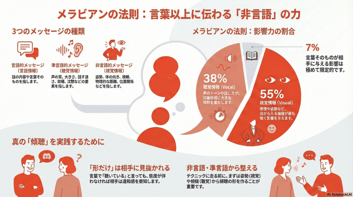 メラビアンの法則では,感情や態度について矛盾したメッセージが発せられたときの人の受け止め方について,与える影響は言語的メッセージがわずか7%,準言語的メッセージが38%,非言語的メッセージが55%を占めるという結果が示されている。つまり,人は「言葉以外」の要素から強く影響を受けるということが示唆される。
