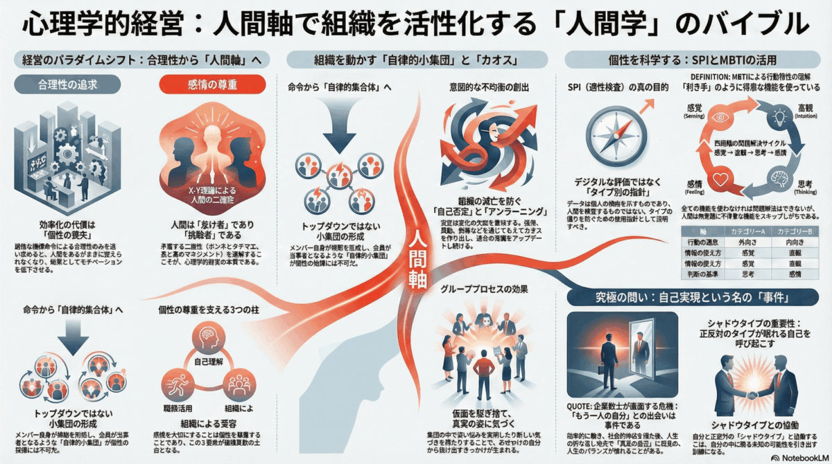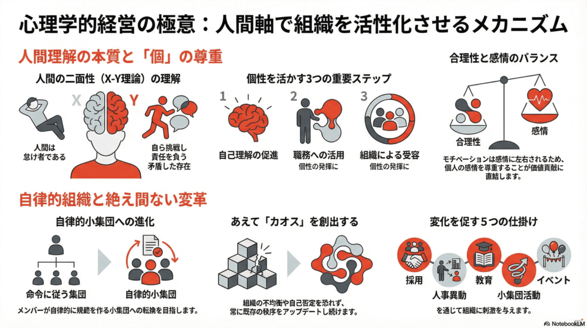 人間と経営の関わりは従来,厳格な指揮命令に従って動く「労働者」として形成されていた。しかし,合理性のみを追い求めることにより個性が失われ,人間をあるがままに捉えられなくなってしまうという。X-Y理論によれば,人間は生来怠け者である(X理論)一方で,自ら挑戦し責任をとることも辞さない(Y理論)側面もある。他にも,人間はホンネとタテマエや表のマネジメントと裏のマネジメントなど矛盾した二面性を持っているが,この性質を理解するところに心理学的経営の本質がある。