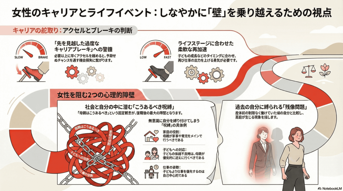 完璧なワークライフバランスを目指すのではなく,その時々の状況に応じて柔軟に対応していく。そして,子どもの成長に合わせて再びキャリアアクセルを踏むタイミングを見極めていく。このような柔軟な姿勢が,ライフステージの変化を乗り越える鍵となります。