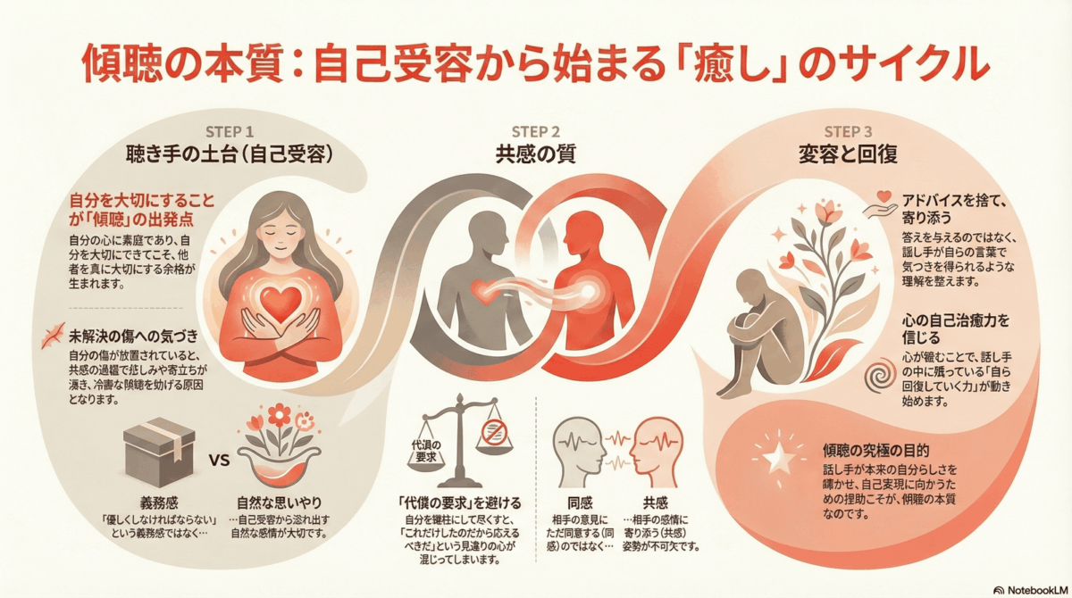 自分自身を大切にできてこそ,「他者に優しくなければならない」という義務感からではなく,人を思いやる気持ちが自然と湧いてくるようになる。本来の自分らしさが輝き出すよう援助することこそが,傾聴の本質なのだ。
