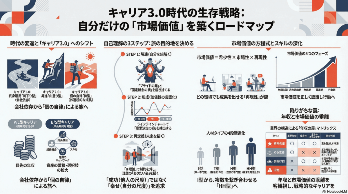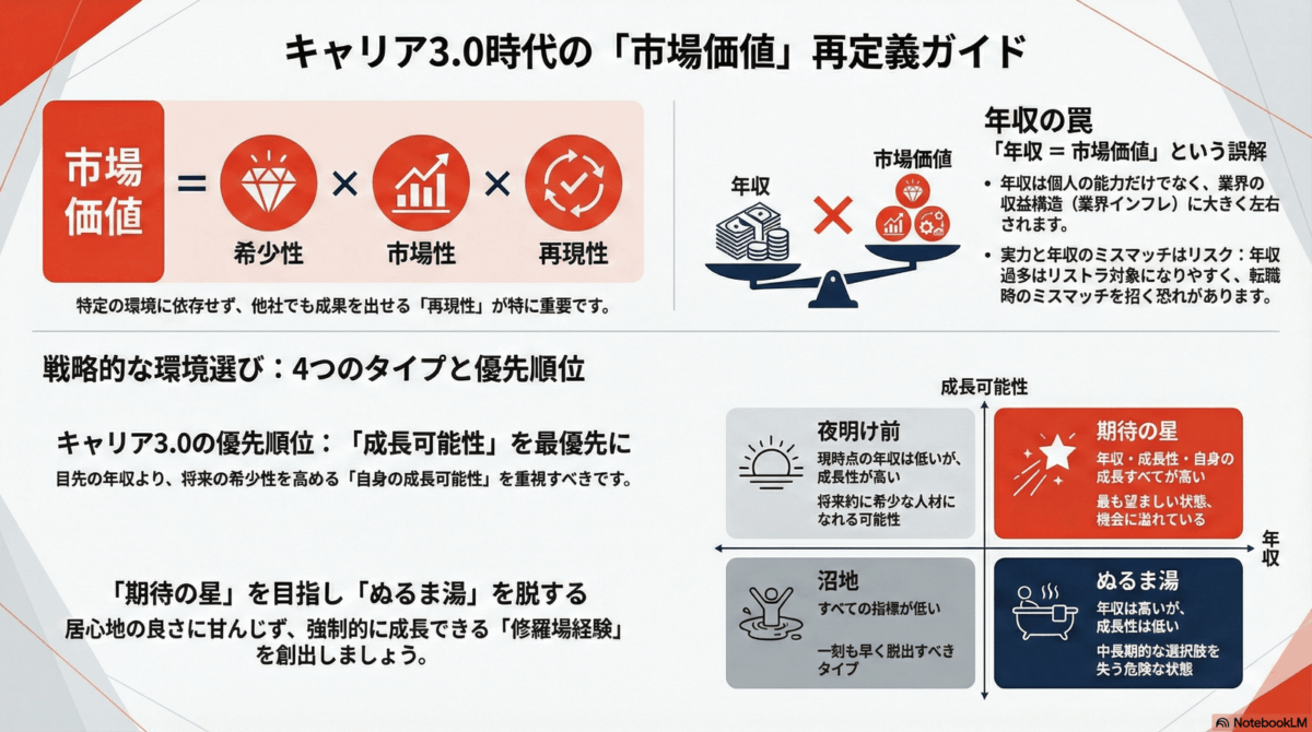 特筆すべきは,「キャリア1.0〜2.0」と「キャリア3.0」の決定的な違いである。それは,会社の看板に安住するか,個人の力で機会を掴み続けるかという点に集約される。看板に頼れず個の力が問われるキャリア3.0の時代において,著者は後に述べる「市場価値」を高めることの重要性を説いている。この変化は,新卒時の就活次第で将来が決まる世界から自らの経験と価値で戦い続けられる世界へと変容したという意味で,よりフェアな競争環境への移行であるとも言えるだろう。