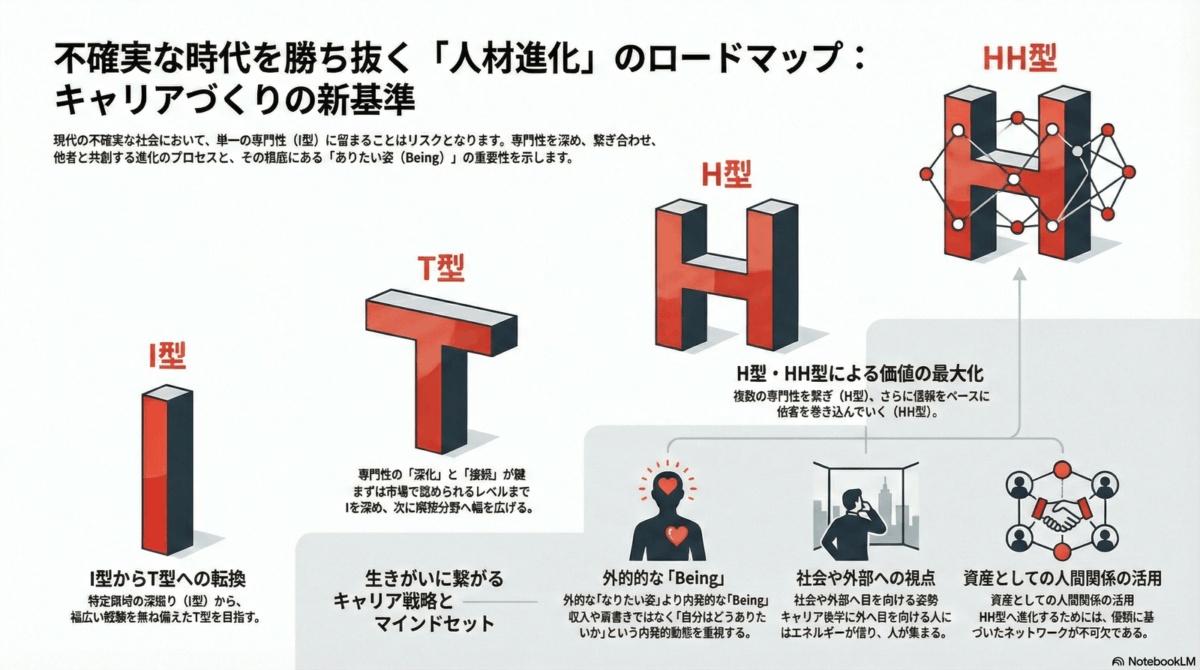 不確実性と流動性が高い現代社会において,単一の専門性のみに依存する「I型人材」が抱えるリスクは大きい。一方で,経営層の多くは「H型人材」や「HH型人材」であるという。筆者は,まずは特定の専門分野(I)を市場から認められるレベルまで深め,そこから隣接分野へと幅を広げた「T型」へと移行すべきだと説く。そして,T型としての深さの成長に停滞を感じ始めたタイミングで,複数の専門性を繋ぎ合わせる「H型」へとシフトしていくステップを,実例を交えて説明している。さらに,このH型をより高次元な「HH型」へと進化させていくためには,信頼をベースにした「資産としての人間関係」を活用することが鍵となる。