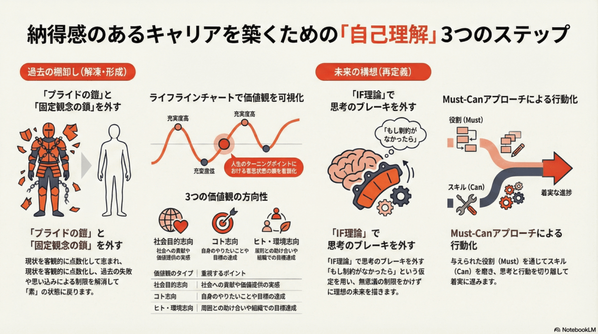 ここまでのプロセスを経て,ようやく「過去の経験に基づいた自己理解」が完了する。あとは,この自己理解を土台として「未来」を描いていけばよい。未来を描く際は,思考と行動を切り離して考えるのが鉄則である。思考においては,「もし…だったら」という仮定で制約を外す「IF理論」やロールモデルを活用し,無意識のブレーキを解放する。一方の行動においては,与えられた役割からスキルを磨く「Must-Canアプローチ」や,周囲の7人から受ける影響を意識する「マジックナンバー7」といった概念を指針に,未来への具体的な歩みを進めていくのである。